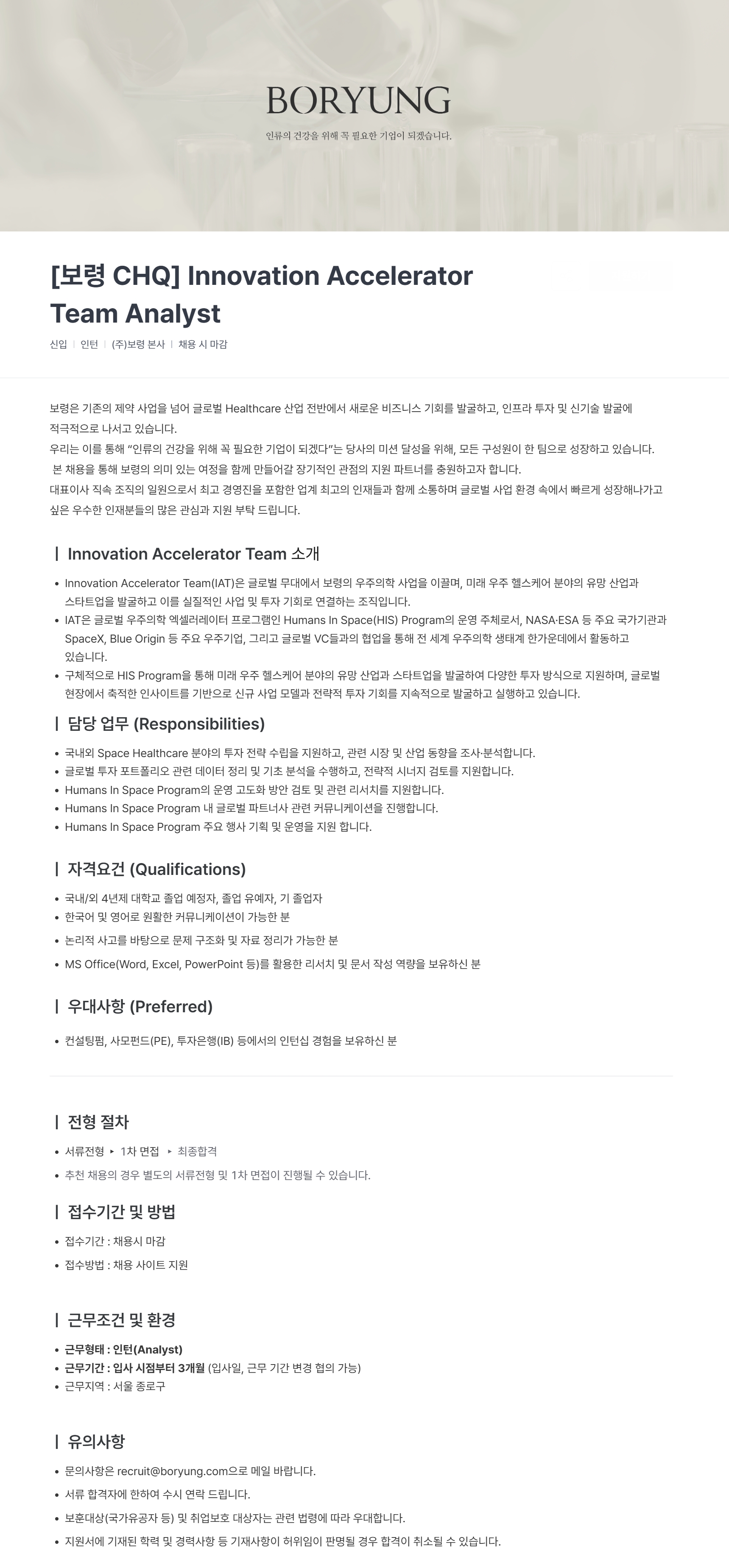 [보령 CHQ] Innovation Accelerator Team Analyst 인턴 채용 (~채용시 마감)