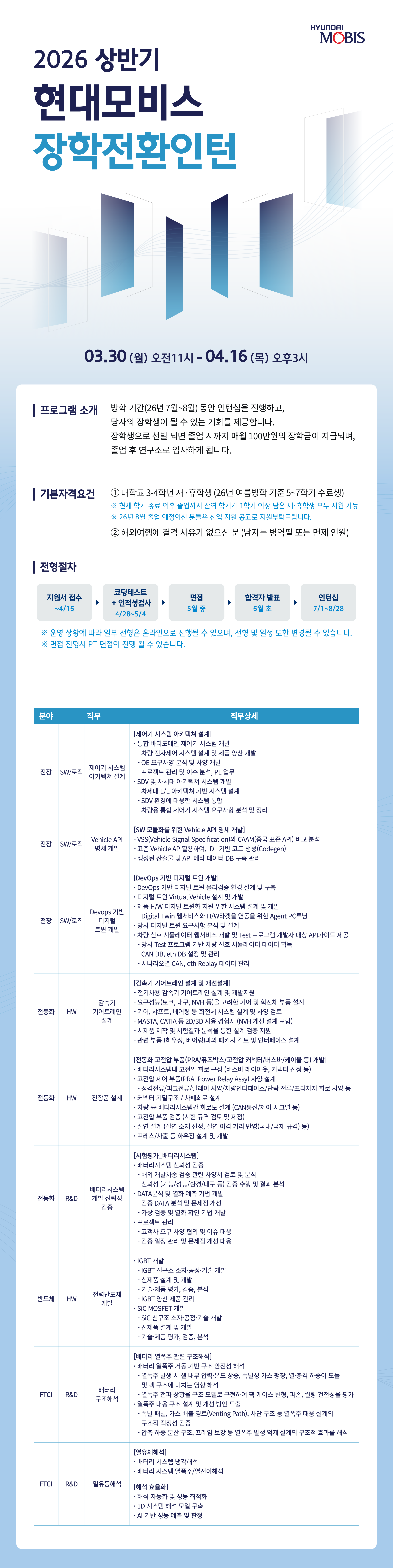 현대모비스에서 26년 상반기 장학전환인턴을 선발하고 있습니다.